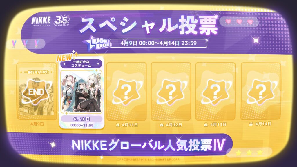 スポンサーリンク ◤第4回NIKKEグローバル人気投票、2日目スペシャル投稿予告!◢ 対象は”一番好きなコスチューム” イベント X LINE コピー コメント 2026.04.09 【スペシャル投票予告:一番好きなコスチューム】#votefornikke2026指揮官が思わず目を奪われたコスチュームはどれですか?✨戦場を彩る数々の衣装の中に、きっと“推し”の一着があるはず——「一番好きなコスチューム投票」が、いよいよ明日開催🗳️投票開始をどうぞお楽しみに🍑… pic.twitter.com/W4hoDD7KsM— 【公式】勝利の女神:NIKKE (@NIKKE_japan) April 9, 2026 勝利の女神:NIKKE 公式設定資料集 created by Rinker KADOKAWA ¥4,400 (2026/04/09 03:05:35時点 Amazon調べ-詳細) Amazon 楽天市場 管理人 これはまた悩ましい… 関連