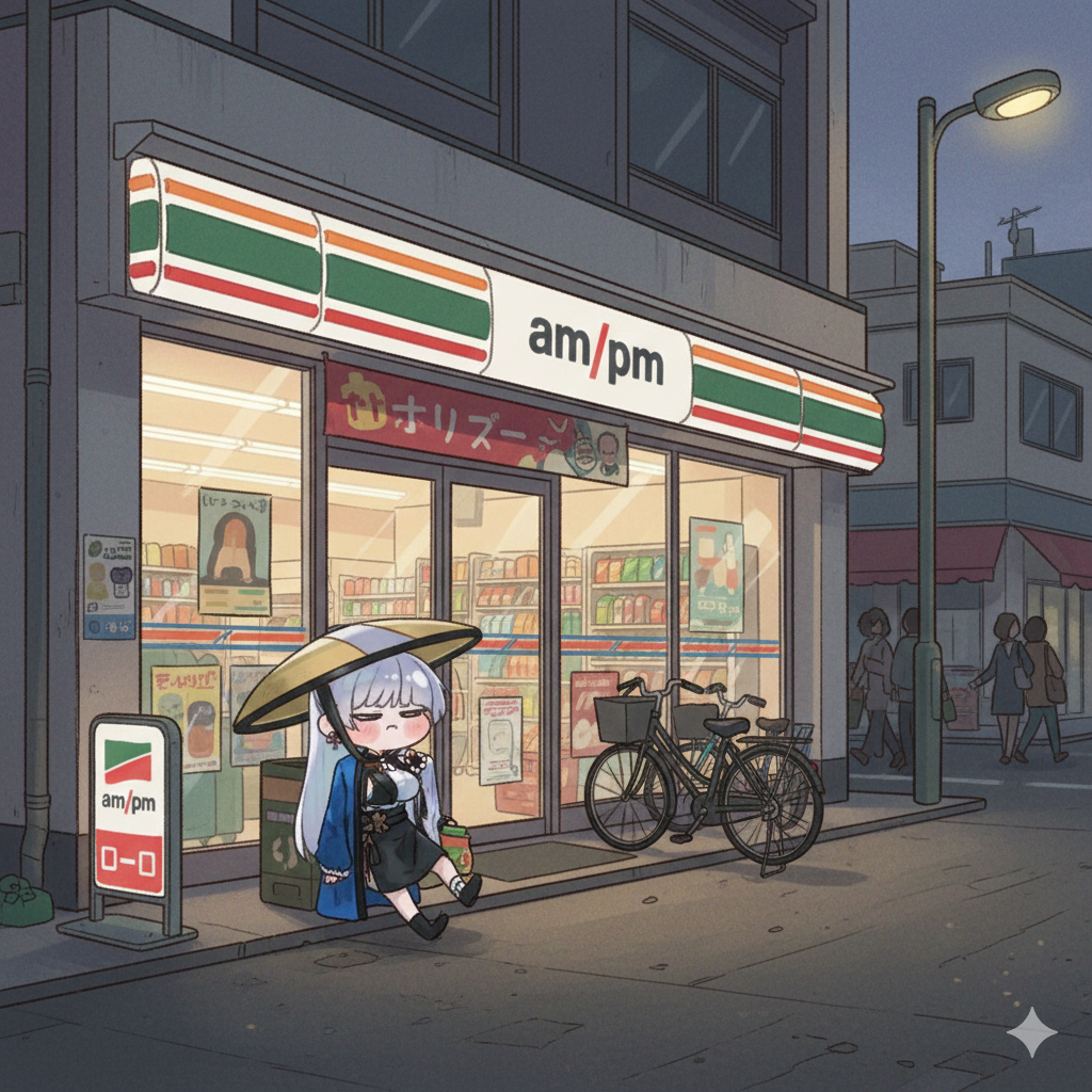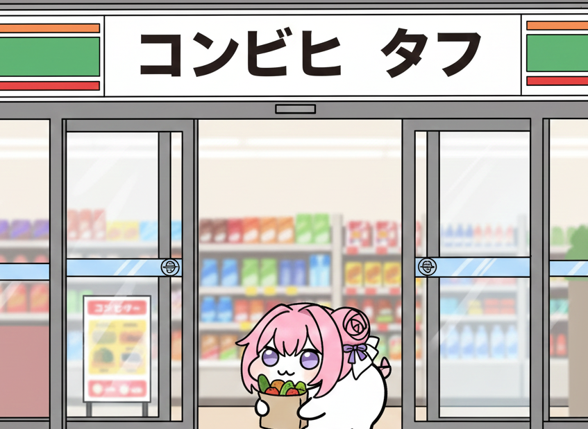 AI君に作ってもらった、コンビニで買い物を終えて出てくるDORO