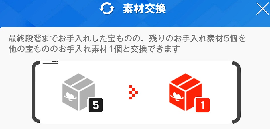 ちょっと補足だが交換できるのは宝もの最大強化した素材だけで交換レートは5:1ね