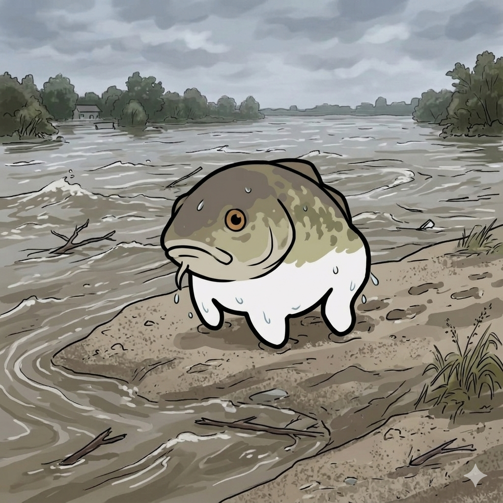 豪雨の後、中洲に取り残されたDOROがいる