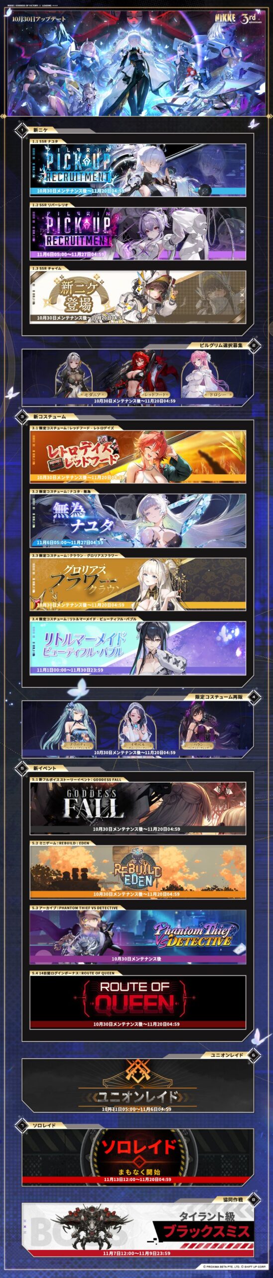 スポンサーリンク 3周年イベント”GODDESS FALL”のアップデート完了!3周年が始まる―― 告知系 X LINE コピー コメント 2025.10.30 【バージョンアップのお知らせ】3周年「GODDESS FALL」バージョンアップが完了いたしました。新メインシナリオ、新ニケ、新コスチューム、新コンテンツなど様々なイベントが実装!詳細は下記URLをご覧ください。◆詳細https://t.co/D6LVw0n3RH◆改善事項https://t.co/xtgk43SqeN… pic.twitter.com/ZLGO3aXRiW— 【公式】勝利の女神:NIKKE (@NIKKE_japan) October 29, 2025 勝利の女神:NIKKE~すいーとえんかうんと~4巻アクスタ付き特装版 created by Rinker 小学館 ¥3,000 (2025/10/29 13:12:32時点 Amazon調べ-詳細) Amazon 楽天市場 管理人 イクゾー 関連