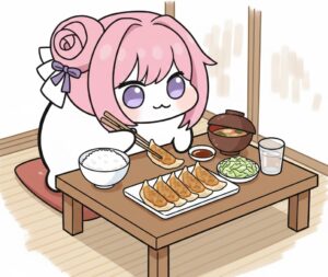朝食に餃子を食べるDORO(AI君生成)