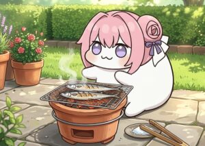 DOROは庭で七輪を使って魚を焼いているようです(AI君生成)